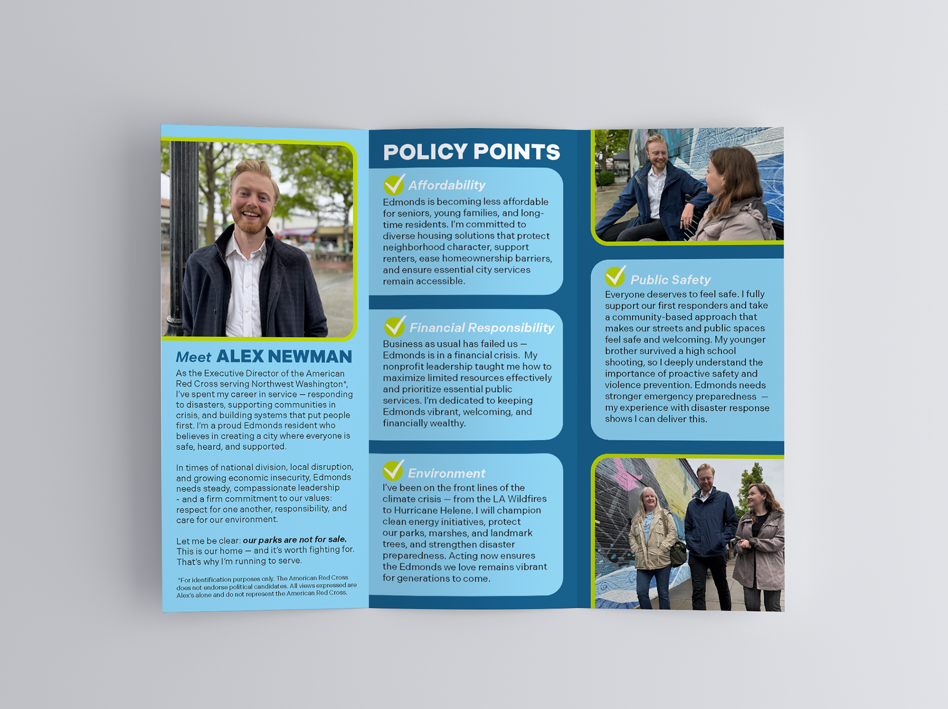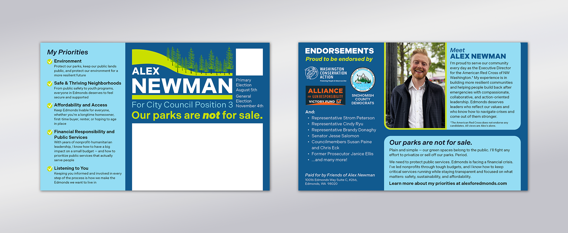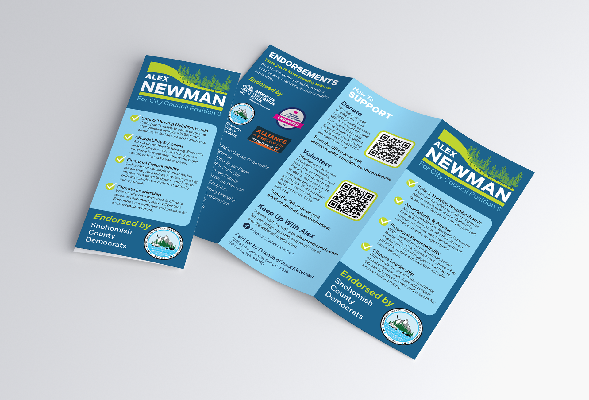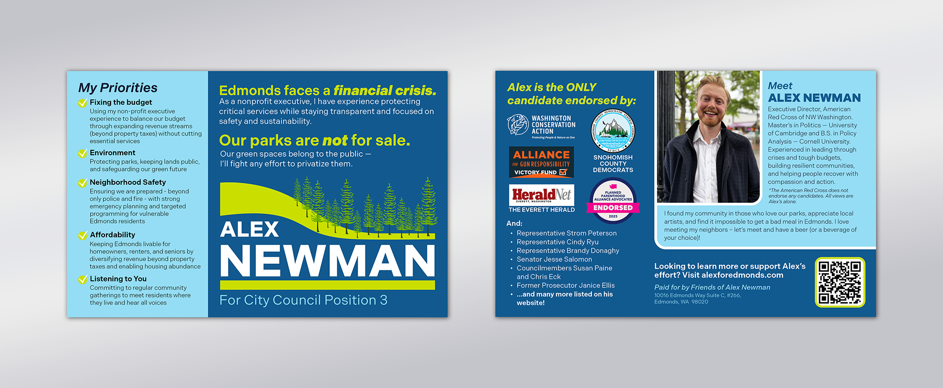 This project involved designing a cohesive visual identity and campaign collateral suite for Alex Newman's campaign for City Council Position 3 in Edmonds, Washington. The materials aimed to communicate Alex’s leadership experience, commitment to community, and priorities around affordability, environmental stewardship, and public safety.