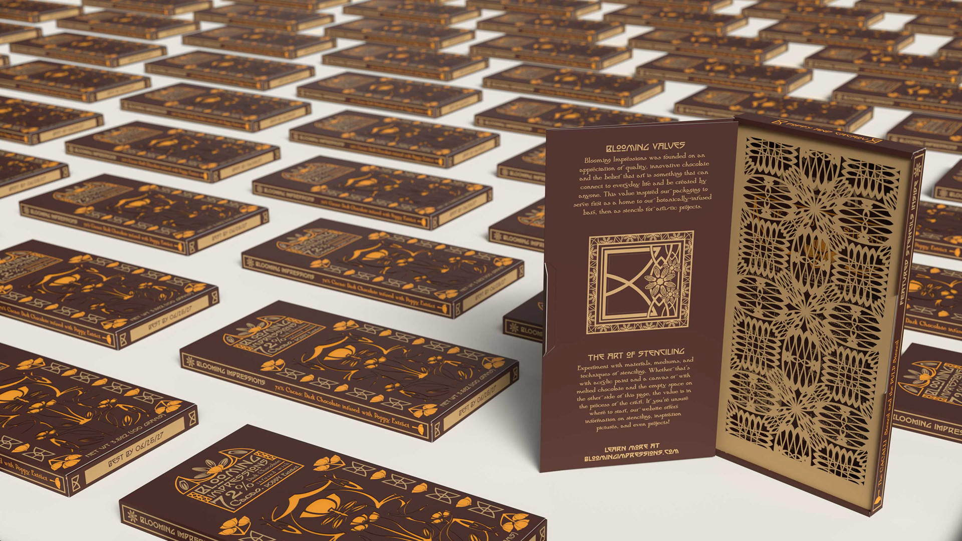 Blooming Impressions was the cumulative project of a packaging design course that focused on chocolate bar packaging. The assignment was to create a chocolate bar brand identity, bar form, and dieline considering aesthetic, sensory, and technical requirements.